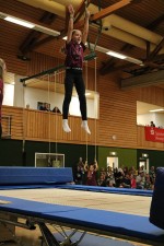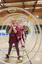 Am Samstagmorgen durften die Kinder nacheinander mit verbundenen Augen einen Geräteparcours entdecken. Nach dem Mittagessen wurden verschiedene Stationen aufgebaut. Es wurde am Reck und Barren geturnt und verschiedene Sprünge von Mini-Tramps auf Matten und Mattenberge wurden geübt. Manch einer wagte erste Übungen im Rhönrad. Beim Schaukeln an den Ringen hatten die Kinder jede Menge Spaß. Selbstverständlich durfte auch der Schwebebalken sowie Airtrack und Trampolin nicht fehlen.