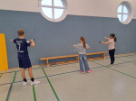 Nach einer kurzen Vorstellungsrunde wurde das beliebte Aufwärmspiel "Feuer-Wasser-Blitz" gespielt. Dann war es so weit, jeder bekam einen Badmintonschläger in die Hand. Um ein Gefühl für die Handhabung des Balls zu bekommen, versuchten die Schüler den Ball mehrmals hintereinander in die Luft zu spielen, ohne dass der Ball auf den Boden fällt. So lernten die Kinder schnell, dass es gar nicht so einfach ist, den Ball gerade hochzuschlagen und es ein paar Anläufe braucht. Als Nächstes wurden Rückhand Aufschläge geübt. Dabei ließ sich Trainer Drumm was Besonderes einfallen, um es den jungen Schülern spielerisch beizubringen. Der Ball stellte eine "Stinkesocke" dar, die vom Körper weggehalten wird. Der Schläger stellte die Tür des Kinderzimmers dar. Die stinkende Socke sollte mit der Bewegung des Schlägers also aus dem Kinderzimmer geworfen werden.