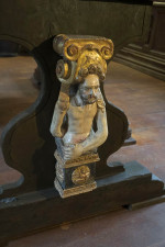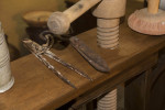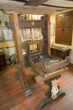 Der neu gestaltete "Bibelraum" im verwinkelten Anwesen in der Hauptstraße 22 in 56316 Niederhofen bietet das passende Ambiente für die zwei Meter hohe Druckpresse aus Eiche: Vom Fußboden mit alten Keramikfliesen und Holzbohlen bis zur Balkendecke und gotischen Keramikkrügen aus dem Siegburger Raum auf Regal und Fensterbank bildet er ein stimmiges Gesamtkunstwerk. Den Fuß der Druckpresse ziert ein um 1600 modellierter Atlas, der den ganzen Druck der Welt auf seiner Schulter trägt.
