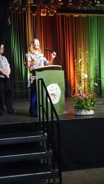 Besonders herzlich empfangen wurden die SWR-Gartenexpertin Heike Boomgaarden und ihr Mann Werner Ollig, die das Klimagärtner-Projekt der LandFrauen betreuten. Sie brachten ihren "Vor-Tour-der-Hoffnung-Bus" mit, gefüllt mit Blumenzwiebeln, die die Gäste am Ende der Veranstaltung mitnehmen durften.
