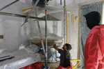 Die Sanierung der durch den Brand am 10. Februar 2023 stark beschädigten Kirche geht voran. Die Spezialisten tragen ein Spezialmittel auf die von Brandgasen beaufschlagten Wände auf, um die Brandgase so aus dem Gemäuer zu entfernen. An einigen Wänden konnten die Malerarbeiten bereits wieder aufgenommen werden.