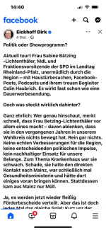 Betzdorf. Am 10. Juni sorgte ein Facebook-Beitrag von Dirk Eickhoff, der sich als Kandidat der CDU um das Direktmandat im Wahlkreis 1 bewirbt, für erhebliche Irritationen. Anstatt sich mit politischen Themen auseinanderzusetzen, griff Eickhoff die SPD-Abgeordnete Sabine Bätzing-Lichtenthäler und den Juso-Kreisvorsitzenden Colin Haubrich persönlich an.