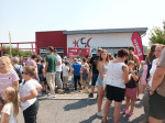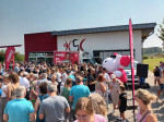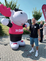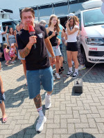 "Puderbach ist der am weitesten entfernte Ort, den wir im Rahmen unserer Eis-Challenge in den letzten beiden Wochen bereist haben", so Kemal Goga, der Moderator der Morning-Show bei SWR3. "Nachdem Puderbach nun doch gewonnen hatte, mussten wir dann die weite Strecke hierhin fahren", ergänzte er mit einem Grinsen. Doch als die Mitarbeiter den Andrang und die Begeisterung sahen, bereuten sie den Weg keine Minute. In und um Puderbach hatten sich alle Altersklassen auf den Weg gemacht, um ihre Mittagspause bei Partystimmung, Musik und einem leckeren Eis beim SWR3-Elch zu verbringen, mit dem auch eine Menge Erinnerungsfotos gemacht wurden. Auch die Baustelle, die das Fahren zum Veranstaltungsort nur über Umwege möglich macht, konnte die Puderbacher nicht abhalten. Kurzerhand machten sie sich zu Fuß, mit Roller oder Fahrrad auf den Weg und so herrschte von der ersten Minute an Hochbetrieb vor der Halle des KSC Puderbach.
