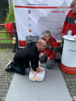Denn auch das DRK Daaden war mit einem eigenen Stand und einem Einsatzfahrzeug vor Ort, mit der ehrenwerten Mission, Öffentlichkeitsarbeit in Form von Reanimationstraining und Sanitätsdienst zu leisten. On top gab es hier einen Eisverkauf, was die turnenden Kinder der gegenüberliegenden Hüpfburg sehr zu schätzen wussten.