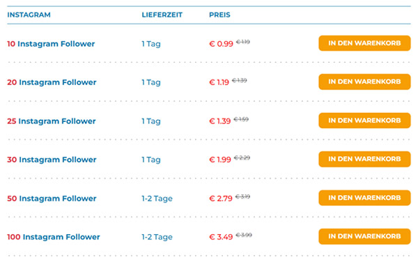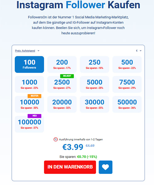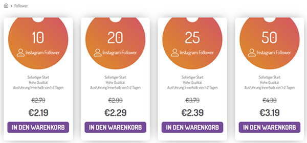 Das kleinste Paket mit 10 Instagram-Followern startet bei 2,19 Euro und einer Lieferzeit von 1-2 Tagen – das größte mit 50.000 Followern kostet 414,99 Euro und benötigt 10-25 Tage. Das Rückgaberecht bleibt für 30 Tage nach dem Kauf erhalten und existiert in Form eines Refills und einer Geld-zurück-Garantie.