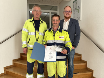 Bürgermeister Andreas Hundhausen dankte im Rahmen einer kleinen Feierstunde im Rathaus Rüdiger Langenbach für dessen langjährige Pflichterfüllung im öffentlichen Dienst und die geleistete Arbeit. Dafür gab es neben einer Urkunde auch ein kleines Präsent. Den Glückwünschen schloss sich Bauhofleiter Joachim Schmidt im Namen des ganzen Teams gerne an. (PM)