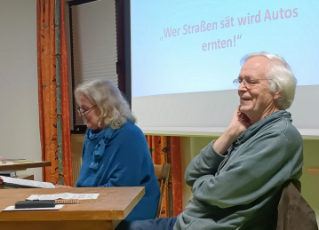 Die Autofahrer seien „Verkehrsgeschöpfe, bestehend aus einer Metallkapsel und einem darin kauernden Menschen“. Dieses Geschöpf sei fasziniert von dem vermeintlichen Gewinn bei maximaler Eigenenergieeinsparung. Es glaube, Beschleunigung und schnelle Verkehrssysteme brächten wirtschaftlichen Nutzen. "Irrtum", sagt Knoflacher, "es gibt nachweislich keine Zeiteinsparung durch Geschwindigkeit. Dieses komplexe Phänomen ist in der Wissenschaft längst als 'Reisezeitkonstanz im System' bekannt. Es bedeutet, dass durch Geschwindigkeitserhöhung lediglich die Wege verlängert, unterm Strich aber weder Fahrtzeiten noch Wege verkürzt werden." Wider besseren Wissen gäben aber Politik und Wirtschaft weiter Milliarden für Straßen, Park- und Stellplätze aus. Die in Kauf genommenen Schäden an Natur und Umwelt seien unverantwortlich und inzwischen unermesslich. Die Ansätze zur Regulierung vergleicht Knoflacher mit dem Versuch, einen Ertrinkenden in einem vier Meter tiefen Pool durch Absenken des Wasserspiegels zu retten. Viele weitere Aspekte stellten die beiden gut informierten Referenten kritisch und umfassend dar, so dass nach dem Vortrag eine lebhafte Diskussions- und Fragerunde den Abschluss des Treffens bildete.