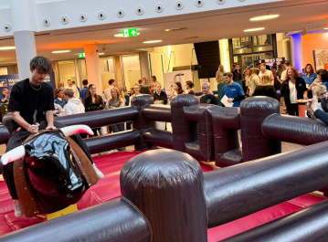 Altenkirchen. Fleißige Hände decken den Boden mit überdimensionalen Planen ab, während Kunden der Westerwald Bank dem geschäftigen Treiben in der Altenkirchener Filiale mit ein wenig Erstaunen zuschauen. Der Arbeitseinsatz ist indes nur von kurzer Dauer. Minuten später wird der Gast, der speziell für diesen Tag „eingeladen“ wurde, auf einem kleinen Hubwagen in die Halle gerollt, das „Monstrum“ dann noch mehr ungläubige Blicke auf sich vereint. Ein ausgewachsener, elektrisch angetriebener Bulle soll in den sich anschließenden Stunden für ein bisschen Jokus vor allem unter den jüngeren Gästen sorgen. Hinter dem Einsatz des kräftigen Tieres steht indes mehr als der reine Spaßfaktor. Es stellt die Verbindung zu einem Ort des Wertpapierhandels her, wo Bulle und Bär  Synonyme für Auf- und Abwärtstrends einer Börse sind. Denn der Stier stößt mit seinen Hörnern nach oben (Kursanstieg), während sein Kontrahent mit der Pranke nach unten schlägt (Kursverfall). Die Stippvisite des wohl wichtigsten Teils eines Rodeos ist an diesem Donnerstag (30. Oktober) die Hauptattraktion einer Premiere.  Unter dem Titel „WeltAktienTag“ wendet sich das Geldinstitut im Rahmen des Weltspartages nicht nur an diejenigen, die brav ihre Spardose zum Entleeren vorbeibringen und dafür das eine oder andere Geschenk erhalten, sondern an einen viel größeren Kreis, um „finanzielle Bildung“ insbesondere für junge Menschen hervorzuheben und auch zu vermitteln. Zudem soll das Bewusstsein für Chancen und Risiken von Aktien als Anlageform geschärft werden. Als Ergänzung zur Möglichkeit des Bullenreitens dienen das knifflige Rätselspiel „The Cube – Wäller Escape Game“, ein acht Stationen umfassender Parcours, um vertiefende  Informationen zu erhalten, und ein Vortrag von Stefan Riebolt, einem Fachmann der Union Investment, der Fondsgesellschaft der genossenschaftlichen Finanzgruppe, der sich unter anderem mit den Stärken und Schwächen des Kapitalmarktes oder der Inflation beschäftigt. Eine ein wenig über die geplante „Sperrstunde“ hinaus verlängerte „After Work Aktien Party“ bildet den lockeren Abschluss des ereignisreichen Tages mit rund 150 Interessenten vor allem aus Kursen des Westerwald-Gymnasiums der Kreisstadt.