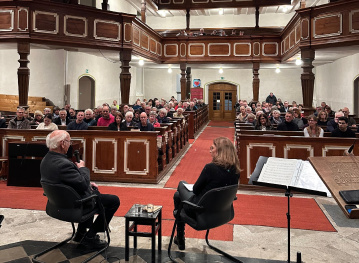 Musikalisch begleitet wurde der Abend vom Duo Klezfluentes aus Koblenz. Mit einer Mischung aus traditionellen und modernen Klezmermelodien schufen die Musiker eine Atmosphäre, die Trauer, Hoffnung und Lebensfreude miteinander verband und die Vielfalt jüdischer Kultur eindrucksvoll erlebbar machte.