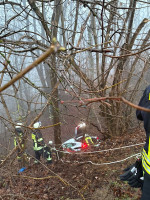 Sowohl der Fahrer als auch der Fußgänger wurden augenscheinlich nur leicht verletzt. Rund 30 Einsatzkräfte unter der Leitung von Michael Schuhen waren vor Ort. Sie leuchteten die Einsatzstelle aus, stellten den Brandschutz sicher und verhinderten, dass Betriebsmittel in den Bachlauf gelangten. Erst nachdem der Abschleppdienst bei der aufwendigen Bergung des Fahrzeugs unterstützt worden war, konnte die Einsatzstelle nach über zwei Stunden verlassen werden.