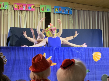 Am Schluss des karnevalistischen Programms dankte Gabriele Hambürger allen Mitwirkenden und Helfern vor und hinter den Kulissen für ihren unermüdlichen Einsatz für den guten Zweck. Besonderer Dank galt den Männern und Frauen des 1. KKV für ihren Theken- und Bediendienst und den Auf- und Abbau der Dekoration. Die Frauen der Theatergruppe erhielten neben Applaus je eine zur Rakete umgebastelte Sektflasche. (PM)