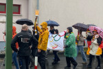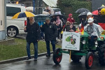Pünktlich um 15 Uhr startete der Umzug ab der Zechenwaldstraße. Flankiert von den Einsatzwagen der freiwilligen Feuerwehr zogen hunderte Schaulustige so gute 40 Minuten durch die Straßen des kleinen Orts. In ihrer Mitte fuhren die drei festlichen Paradewagen. Zwei zeigten eine Apres-Ski-Hütte und eine Skeleton-Fahrerin, der dritte und größte diente der Protagonistin und ihren Angehörigen zur Fortbewegung. Wie gewaltig der Andrang tatsächlich war, wurde bei der Ankunft an der Peter-Hussing-Halle ersichtlich: Gegen 15.40 Uhr erreichte der Zug den ihr vorgelagerten Schulhof und hielt für ein kleines Feuerwerk am hinteren Ende in perfekter Aufstellung. Vom anderen Ende aus war nun nur noch ein Meer aus Regenschirmen zu erkennen, die den gesamten Hof zu umspannen schienen.