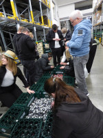 Die erste Station führte die Gäste an zwei große Bottiche mit druckfrischen Kronkorken, wo der eigene Korken – oder natürlich auch der von Bekannten – gesucht werden konnte. Niemand ließ sich lumpen und alle hatten bei der Suche viel Spaß. Hier wurden bereits die ersten Erfrischungen gereicht. Von da aus ging es weiter in die brandneue Flaschenabfüllung, wo Geschäftsführer Jens Geimer die Gäste persönlich begrüßte und die neue Anlage bei dezenter Untermalung mit Saxophonmusik bewundert werden konnte.