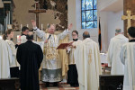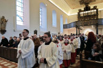 Die Kirche füllte sich schnell mit rund 400 Gottesdienstbesucherinnen und -besuchern, darunter eine große Abordnung der Freiwilligen Feuerwehr der Verbandsgemeinde Wissen mit dem Wehrleiter Stefan Deipenbrock. Den Einzug der Geistlichkeit gestalteten die Schützenbruderschaften aus dem Stadtteil Schönstein und der Ortsgemeinde Birken-Honigsessen sowie der Schützenverein Wissen, die Karnevalsgesellschaft und die Kolpingfamilie jeweils mit ihren Fahnen. Alle Anwesenden konnten merken, dass die Neueinsegnung des Gotteshauses bei Pfarrer Kürten wie eine Befreiung wirkte. Die lange Zeit des Wartens (und oft auch des Bangens) war vorbei. Die feierliche Messe wurde durch einen Projekt-Chor, geleitet von Andreas Auel sowie Musikern und Musikerinnen der Bergkapelle "Vereinigung" Birken-Honigsessen musikalisch begleitet. Im Rahmen der Ökumene war der evangelische Pastor Tesch ebenfalls erschienen und gestaltete den Gottesdienst mit.