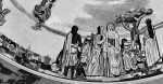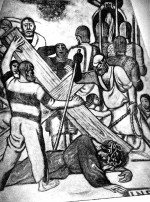 Direkt unter der Rundung hat er in vier Szenen die Passion Christi höchst eindrucksvoll wiedergegeben. Besonders die Dornenkrönung mit dem schmerzverzerten Gesicht des Erlösers sorgt noch heute für einen regelrechten Schauer. In der Szene "Christus fällt unter dem Kreuz" bricht der Erlöser unter der Balkenkonstruktion zusammen. Die kraftvolle Gestalt links im Vordergrund stellt vermutlich Simon von Cyrene dar. Auf der gegenüberliegenden Seite tritt ein finster blickender Mann mit Stock und Strick auf. Ein Engel will ihn offenbar zurückhalten. Die Aufnahme von vermutlich 1931 nach der Beendigung des umfangreichen Hecker'schen Bildwerks zeigt den unteren Rand der Kuppel mit dem schon erwähnten Hahn (links) als Teil einer ausgedehnten Natursymbolik. Daneben sind rundum vier Apostelgruppen zu sehen. Hier, im östlichen Bildfeld, erkennt man Maria in Begleitung von zwei Frauengestalten. (PM)