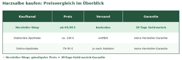 Der größte Unterschied zwischen den verschiedenen Kaufmöglichkeiten der Harzsalbe ist der Preis. Im Online-Shop des Herstellers ist die Harzsalbe aktuell ab 69,90 Euro erhältlich – inklusive kostenlosem Versand. In stationären Apotheken liegt der Preis in der Regel bei einem UVP von 100 Euro, also rund 30 Euro mehr für dasselbe Produkt. Online-Apotheken bewegen sich je nach Anbieter zwischen 75 und 95 Euro.