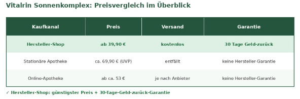 Wer Vitalrin Sonnenkomplex zum ersten Mal ausprobieren möchte, kauft am sinnvollsten direkt beim Hersteller unter www.vitalrin.de. Kostenloser Versand, die 30-Tage Geld-zurück-Garantie und etliche Stammkunden sprechen klar dafür. Das finanzielle Risiko ist damit auf null reduziert – bei einem Produkt, dessen Wirkung von individuellen Faktoren abhängt, ist das ein großer Vorteil. Für die Beratung oder bei spezifischen gesundheitlichen Fragen ist die stationäre Apotheke auch eine gute Wahl. (prm)