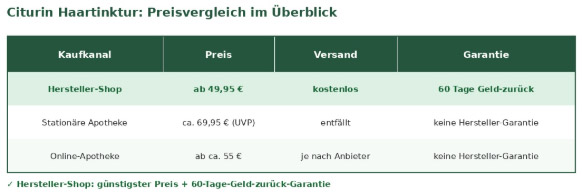 Im Online-Shop des Herstellers unter www.citurin.com ist die Tinktur deutlich günstiger als in stationären Apotheken, wo sie in der Regel zum UVP von 69,95 Euro angeboten wird. Online-Apotheken bieten Citurin ab rund 55 Euro an – günstiger als in Apotheken vor Ort, aber immer noch über dem Hersteller-Preis. Da die Preise in Online-Apotheken teils stark variieren, lohnt sich vor dem Kauf ein kurzer Preisvergleich im Netz. Der Grund für den günstigeren Hersteller-Preis liegt wie in der direkten Lieferkette: Apotheken kaufen über Großhändler ein und kalkulieren ihre Handelsmarge dazu. Im Hersteller-Shop entfällt dieser Zwischenschritt.