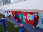 Ein zentraler Bestandteil des Projekts war die Gestaltung eines Teils der Fassade des KiTa-Gebäudes. Die Kinder arbeiteten gemeinsam mit dem Künstler an der Umsetzung und konnten ihre Ergebnisse direkt sichtbar machen.