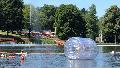 Kurz nach der Ankunft wurden die Schwimmwesten angelegt und eine Fahrt mit dem Motorboot unternommen. Anschließend vergnügten sich die Kinder auf der Wasserrutsche oder bei einer Schwammschlacht. In der großen Wasserrolle, mit der man wie in einem Hamsterrad über die Wasseroberfläche laufen kann, konnte man sich so richtig austoben.