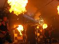 „Völkerball“ brannte von der ersten Sekunde an ein Feuerwerk, im wahrsten Sinne des Wortes, ab. Zu den markanten, weltbekannten Hits von „Rammstein“, wurde in großem Umfang Pyro-Technik eingesetzt, die manchmal bizarre Effekte auf die Bühne und ins Zelt zauberte. Hundertfach ertönte aus dem Publikum die Unterstützung von Renè Anlauf, wenn er „Feuer frei, Links 2,3,4, Du riechst so gut, Mein Herz brennt, Benzin, oder Waidmanns Heil“ anstimmte, das Publikum und der Gesang verschmolzen zu einer Einheit, Gänsehaut pur. Die Spielfreude der Musiker übertrug sich voll und ganz auf die Fans. Textsicher beteiligte sich die feiernde Menge, Renè hatte alles im Griff, die Leute warteten nur darauf, von ihm dirigiert zu werden. Eine erhobene Hand und schon streckten sich hunderte von Händen nach oben. Einfach ein gigantischer Zusammenspiel, ein Geben und Nehmen auf hohem Niveau.