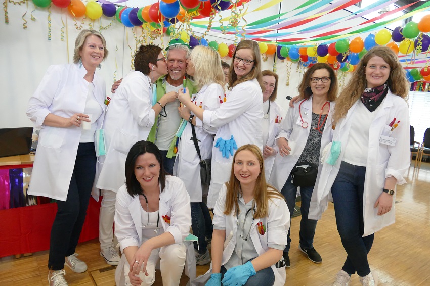 Gegen Mittag trafen dann Polizisten, Feuerwehrmänner und weitere männliche Patienten und Ärzte im geschmückten Wilhelm-Boden-Saal ein, um gemeinsam zu feiern. Neben praktischen Erste-Hilfe-Übungen wurde auch das medizinische Fachwissen der anwesenden Ärztinnen und Ärzte auf den Prüfstand gestellt. Auch der Westerwälder Wirbelwind Carmen Neuls durfte selbstverständlich nicht fehlen, sie zog mit ihrem Vortrag alle in ihren Bann. Ein weiteres Highlight war wieder einmal die eigene Tanzgruppe der Kreisverwaltung, deren Operateure wie auch in der Vergangenheit erneut durch einige Krankenschwestern unterstützt wurden. Auch in diesem Jahr konnten sie den Saal nicht ohne eine Zugabe verlassen.