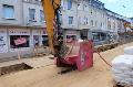 Stadteinwärts wird in Wissen ab Regiobahnhof im Moment ausgebaggert, um die neuen Ver- und Entsorgungsleitungen in der Rathausstraße zu verlegen. Das ausgehobene Material, was hierbei zum Vorschein kommt, kann leicht entnommen werden, so dass die Arbeiten schnell voran schreiten und zudem bietet es sich optimal zu einer ökologischen Weiterwendung an.