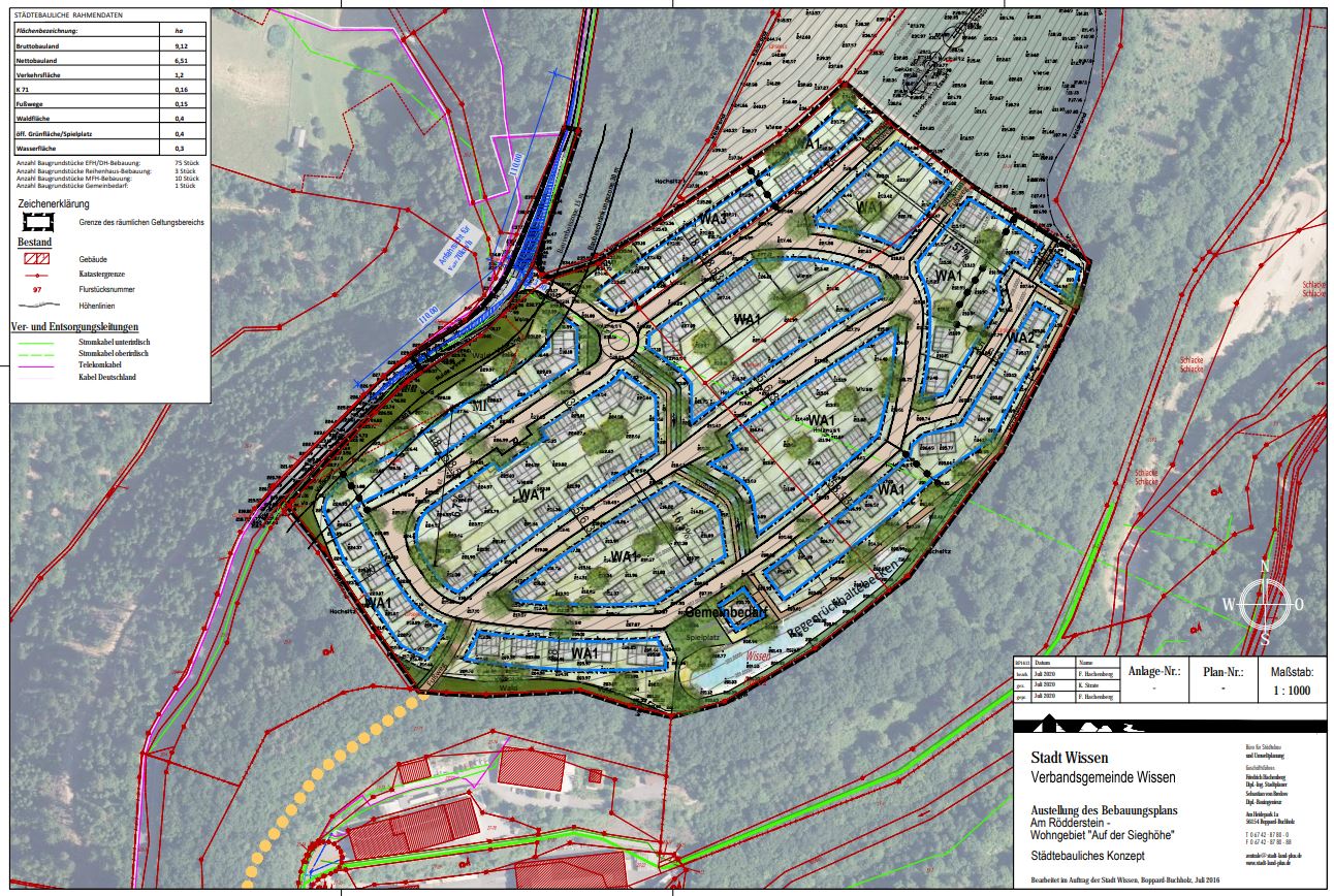 Der Vorentwurf für das in Wissen neu entstehende Wohnbaugebiet Am Rödderstein „Auf der Sieghöhe“ steht und entspricht den städtebaulichen Anforderungen mit einer nachhaltigen Planung. Da allgemein ein Nachholbedarf bei der Entwicklung von Bauland besteht, die Nachfrage auch in Wissen schon jetzt sehr groß ist und der Plan durchweg auf positiven Tenor stieß, wurde dem Vorentwurf einstimmig zugestimmt.