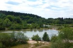 Nach erfolgreicher Stärkung wandern wir von der Sängerhütte Richtung Tongrube bis zur nächsten Wegkreuzung weiter. Dort biegen wir links in einen maroden Feldweg ein. Schon bald sehen wir rechts einen See durch die Bäume schimmern. Uns durch das Gebüsch Richtung See schlagend, blicken wir auf ein Naturbiotop, das unsere Blicke magisch anzieht. Nur das Gequake der Frösche durchdringt die Stille, die sich auf uns überträgt. Aus der ehemaligen Tongrube ist ein Naturparadies entstanden, das den Amphibien und verschiedenen Vogelarten nun als natürlicher Lebensraum dient. Ein aufgescheuchter Fischreiher lässt vermuten, dass in diesem See auch Fische heimisch sind. Auch hier leistet der Fotoapparat wieder Schwerstarbeit. Der hintere Teil der Tongrube wurde später als Erddeponie betrieben und aufgefüllt. Auf dem Gelände ist nun ein Photovoltaikfeld installiert.