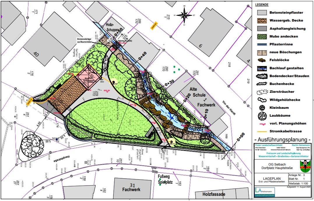 Wenn alles gut läuft, werden Ende November Erd- und Tiefbauarbeiten durch die Firma Michael Rödder erledigt sein. Dann geht es in Eigeninitiative der Selbacher weiter und man wird mit der Bepflanzung des Platzes loslegen. Bei einem Gesamtkostenvolumen von rund 125.000 Euro, davon rund 79.000 Euro, die die Gemeinde an Fördergeldern vom Land erhält, stehen immer noch rund 11.000 Euro an Eigenleistung vor der Brust. Bereits jetzt hat die Gemeinde Zusagen für „Baumspenden“. Dennoch, so Grohs, wolle man genauso wie bei der Planung des Pavillons gerne auf „freiwillige Potentiale“ aus dem Ort zurück greifen und sei über jede weitere finanzielle Unterstützung und Spende zum „Projekt, das Selbach prägen wird“, wie er es in der letzten Sitzung des Ortsgemeinderates nannte, froh und dankbar. Die Einweihung des Dorfplatzes ist für den Frühsommer 2021 geplant. (KathaBe)