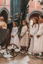 Mittelhof/Marienstatt. So konnten die Kinder am 10. Oktober ihre erste heilige Kommunion in der Abtei Marienstatt, begleitet von ihren Eltern, Großeltern und Paten, empfangen. Mit brennenden Kerzen zogen die Kommunionkinder zusammen mit ihren Eltern in die Abteikirche ein. Gemeinsam mit Pfarrer Roth, der von Diakon Karl-Heinz Becher, dem Großvater eines der Kommunionkinder, begleitet wurde, sowie Geschwistern, Cousinen und einem Cousin, die als Messdiener im Einsatz waren, feierte man einen sehr persönlichen und feierlichen Gottesdienst.