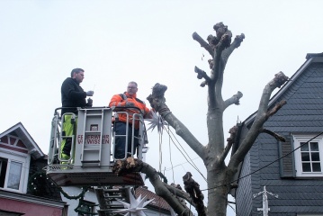 Wissen. Der Bauhof brachte mit Hilfe der Feuerwehr- Drehleiter weihnachtlichen Schmuck über der Rathaus-, Markt- und Mittelstraße an. Der Platane auf dem Marktplatz widmete man besondere Aufmerksamkeit. Sie bekam einige weiße Sterne verpasst, die ebenfalls spätestens am Samstag den Ersten Advent einläuten. (PM)