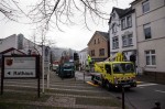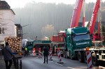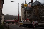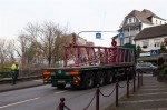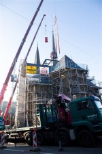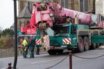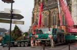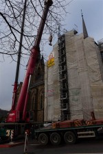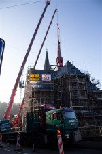 Nachdem die vier Kräne einsatzbereit waren, wurde der Verkehr um die Kirche eingeschränkt. Ab ca. 13.30 Uhr war schließlich die Lindenstraße bis in den Abend hinein. gesperrt. Der Grund: Die komplette Breite der Straße wurde benötigt, um den Schwertransport zu gewährleisten. So mussten die für den Abbau benötigte Unterkonstruktion und das abgebaute Gerüst bewegt werden. Beide waren auf dem Parkdeck gegenüber der Verwaltung zwischengelagert. Am Samstag wurden sie demontiert und in Einzelteilen abtransportiert.