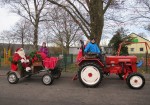 Pracht. Doch als es nun soweit war fand er leere Räume vor. Kein Kinderlachen klang ihm entgegen, keine Weihnachtslieder begrüßten ihn. Corona bedingt waren die Kinder bereits frühzeitig zu Hause geblieben. Sollte der Weihnachtsmann jetzt wieder unverrichteter Dinge gehen, die Geschenke einfach im Kindergarten liegen lassen. Nein, damit fand sich der Weihnachtsmann nicht ab. Statt den Rentierschlitten stieg er witterungsbedingt auf eine Kutsche um, die aus Mangel an Pferden von dem Traktor der Familie Bust gezogen wurde.