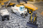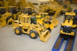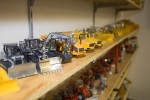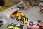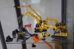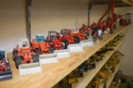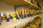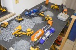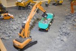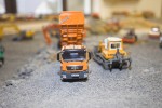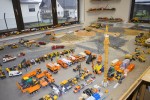 Auf dieser Platte sind realistische Baustellensituationen nachempfunden. Da sind Raupen, Bagger, Radlader, LKW und natürlich die unterschiedlichsten Baustoffe zu sehen. An den Wänden in den Regalen stehen diverse Modelle in Reih‘ und Glied. Die meisten Modelle erwirbt Marc Abresch heute käuflich. Einige Hersteller findet er im Internet, früher gab es ja noch etliche Spielwarenläden, aber die sind heute sehr rar geworden. Da nicht übermäßig viele Sammler dem Hobby frönen, sind Tausch- und Sammlerbörsen selten und in diesem Jahr war in dieser Richtung nichts möglich.