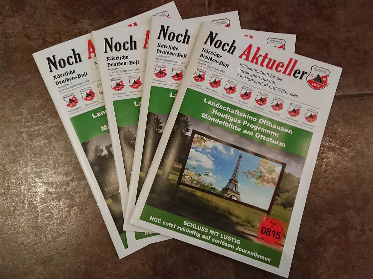 Neben bilderreichen Vorstellungen der einzelnen Abteilungen ragen gleich mehrere Beiträge heraus. Auf die Körper von Staatschefs und internationalen Politikern hat man die Köpfe des Vorstands gesetzt. So lernt der Leser etwa Janina Merkel (HCC-Vorsitzende Janina Berndes) kennen oder auch Nadia Lagarde (Kassiererin Nadja Kreps). Der einzige Politiker, der vom HCC-Makeover verschont wurde? Donald Trump. Das ist allerdings eine zweifelhafte Ehre. Denn die Druidenpost macht den mittlerweile abgewählten US-Präsidenten zum Hoppeditz, Obernarr und Maskottchen des Vereins.