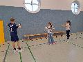 Nach einer kurzen Vorstellungsrunde wurde das beliebte Aufwärmspiel "Feuer-Wasser-Blitz" gespielt. Dann war es so weit, jeder bekam einen Badmintonschläger in die Hand. Um ein Gefühl für die Handhabung des Balls zu bekommen, versuchten die Schüler den Ball mehrmals hintereinander in die Luft zu spielen, ohne dass der Ball auf den Boden fällt. So lernten die Kinder schnell, dass es gar nicht so einfach ist, den Ball gerade hochzuschlagen und es ein paar Anläufe braucht. Als Nächstes wurden Rückhand Aufschläge geübt. Dabei ließ sich Trainer Drumm was Besonderes einfallen, um es den jungen Schülern spielerisch beizubringen. Der Ball stellte eine "Stinkesocke" dar, die vom Körper weggehalten wird. Der Schläger stellte die Tür des Kinderzimmers dar. Die stinkende Socke sollte mit der Bewegung des Schlägers also aus dem Kinderzimmer geworfen werden.