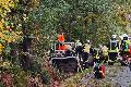 Die Feuerwehr musste einige Äste und Zweige entfernen um an das verunfallte Fahrzeug zu gelangen. Anschließend wurden bei dem Pkw eine Tür sowie das Dach entfernt, um die verletzte Frau aus dem Pkw zu retten zu können. Hierbei kam auch die Rettungsplattform zum Einsatz. Gemeinsam mit dem Rettungsdienst wurde die verletzte Frau dann in einen der bereitstehenden Rettungswagen gebracht. Der vorsorglich alarmierte Rettungshubschrauber aus Köln (Christoph 3) konnte ohne Verletzte wieder abheben.