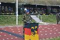 Dr. Sven Funke, der scheidende Regimentskommandeur, begrüßte in seiner Abschiedsrede zahlreiche Ehrengäste. Die Begrüßung allein nahm mehrere Minuten in Anspruch. Genannt wurden unter anderem Generalarzt Dr. Bruno Most, Kommandeur des Kommandos Sanitätsdienstliche Einsatzunterstützung aus Weißenfels, und Hendrik Hering, Präsident des rheinland-pfälzischen Landtags in Mainz. Des Weiteren waren viele hochrangige Vertreter der Bundeswehr, auch der Generalität, und Politiker aus der Bundes-, Landes- und Kommunalpolitik anwesend. Ein Hauch Internationalität wehte über dem Sportplatz, als Dr. Funke ehemalige Kameraden aus den Verbindungseinheiten der französischen Armee und der US-Army begrüßte. Persönliche Grußworte richtete der scheidende Kommandeur an seine eigene Familie, die ihn nun am Ende des Regimentsappells mit nach Hause nehmen konnte, und an die Familie seines Nachfolgers Oberstarzt Jan Ulrich Schuppert.