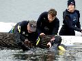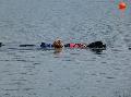 Eine bewusstlose Person, die im Wasser treibt, an den Armen zu packen und diese ans Boot zu ziehen, gehört da schon zu den schwierigen Disziplinen. Ganz schwer wird es, wenn sich zwei Personen im Abstand von etwa 20 Metern nebeneinander im Wasser befinden, eine Person dabei den Bewusstlosen spielt und die andere Person währenddessen als Ertrinkender durch lautes Rufen und Schreien auf sich aufmerksam macht. Dann nämlich muss der Hund zuerst zum Ertrinkenden schwimmen, darauf achten, dass dieser sich am Rettungsgeschirr festklammert, dann mit dem Ertrinkenden zum Bewusstlosen schwimmen, diesen am Arm packen und beide Personen gleichzeitig an Land ziehen. Das Hundetraining der Hunde am Wiesensee scheint sich großer Beliebtheit zu erfreuen, denn nicht selten werden die Hunde morgens schon von hundebegeisterten Zuschauern erwartet, die die Übungen der Wassersportgruppe mit Interesse verfolgen.