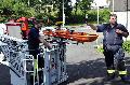 Die Übungen begannen jeweils mit einer theoretischen Unterweisung und der Vorstellung der technischen Möglichkeiten. Die Übung mit der Drehleiter wurde von Andreas Wieschollek geleitet. Zunächst wurden das Positionieren des Fahrzeuges und die Einsatzgrundsätze erläutert. Der Einsatz der Krankentragehalterung ist eine der Möglichkeiten, die die Drehleitern mit Korb heute bieten. Dabei gilt es jedoch insbesondere die Lastgrenze zu beachten, um die Drehleiter sicher einsetzen zu können. Hier kommt es auch darauf an, ob neben der Einsatzkraft, die im Korb tätig wird, noch ein Mitarbeiter des Rettungsdienstes „an Bord“ ist. Die Grenze für die Belastbarkeit liegt bei 130 Kilogramm, wenn ein Feuerwehrmann im Korb ist. Weiter wurde dann der Einsatz der Schleifkorbtrage, die sich ebenfalls auf dem Korb befestigen lässt, erläutert. Diese Trage macht es durch die größere Anzahl von Tragegriffen einfacher, die Person erschütterungsfrei zu retten. Die Drehleiterübung fand am Gerätehaus des LZ 1 statt.
